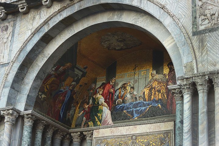 Cuenta la leyenda que, para sacar el cuerpo del Santo de Alejandría, unos comerciantes italianos lo ocultaron entre su carga de cerdo, de manera que los musulmanes no pudieran ser capaces de detenerles. Al llegar a Venezia lo entregaron al dux, que ordenó erigir una Iglesia para albergar sus restos. Esta historia, se describe en la decoración de los arcos de la fachada de la Basílica, junto a otros acontecimientos de la vida de San Marcos.