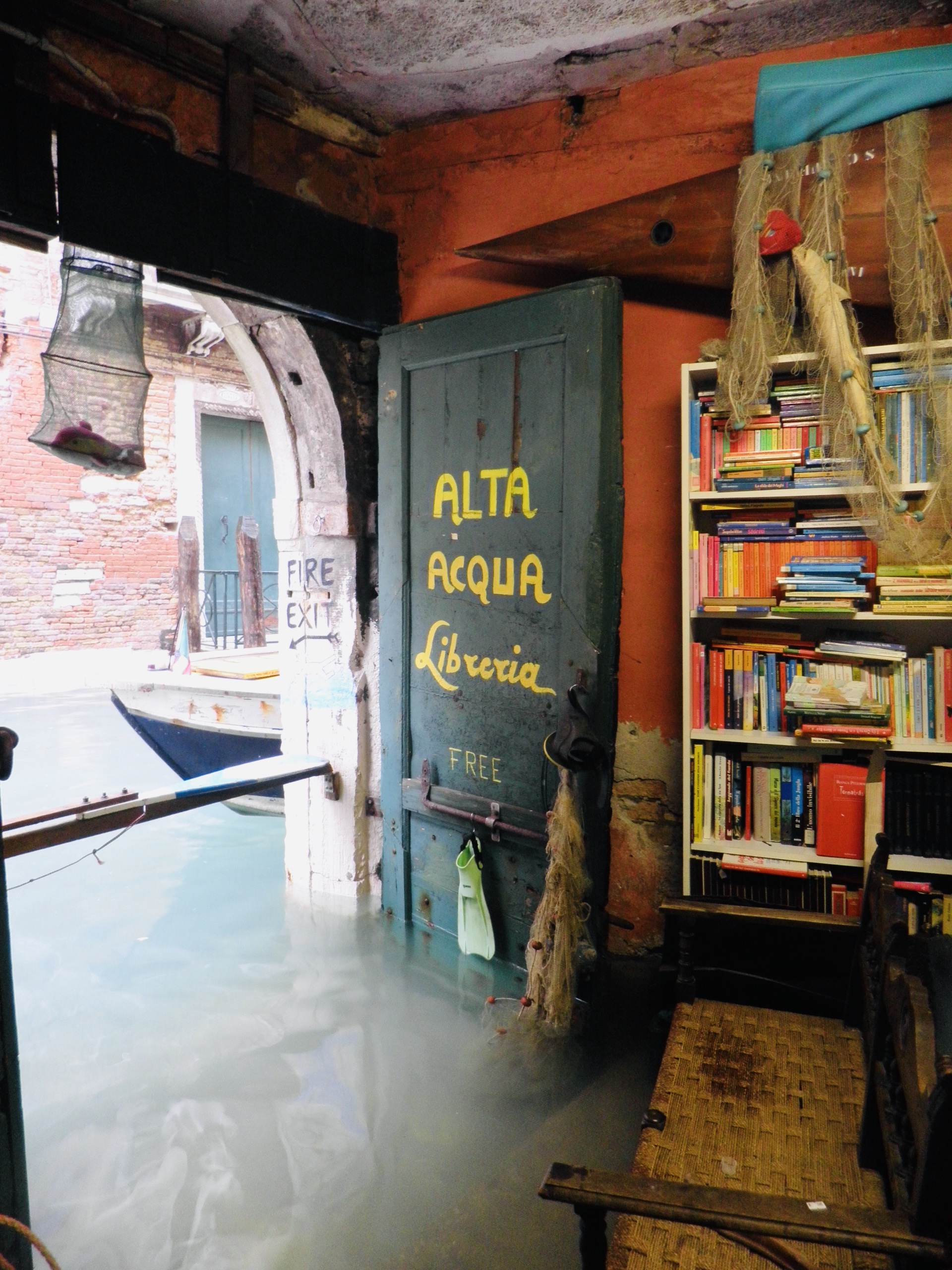 9.- La librería Acqua Alta. Entre Campo Santa Maria Formosa y Campo San Giovanni e Paolo se encuentra, en una pequeña plaza, esta librería de viejo que, como todo en Venecia, tiene su encanto en lo decadente y pintoresco de la disposición de sus ejemplares. Bañeras, góndolas y cualquier otro objeto que salve a los libros del fenómeno del Acqua Alta convierten la visita en imprescindible. No puedo resistirme a comprar algo cada vez que entro allí, una antigua postal, una curiosa libreta, una vieja edición de algún librito… y varias de las fotos que he tomado allí, adornan una de las paredes de mi biblioteca, en la buhardilla de casa.