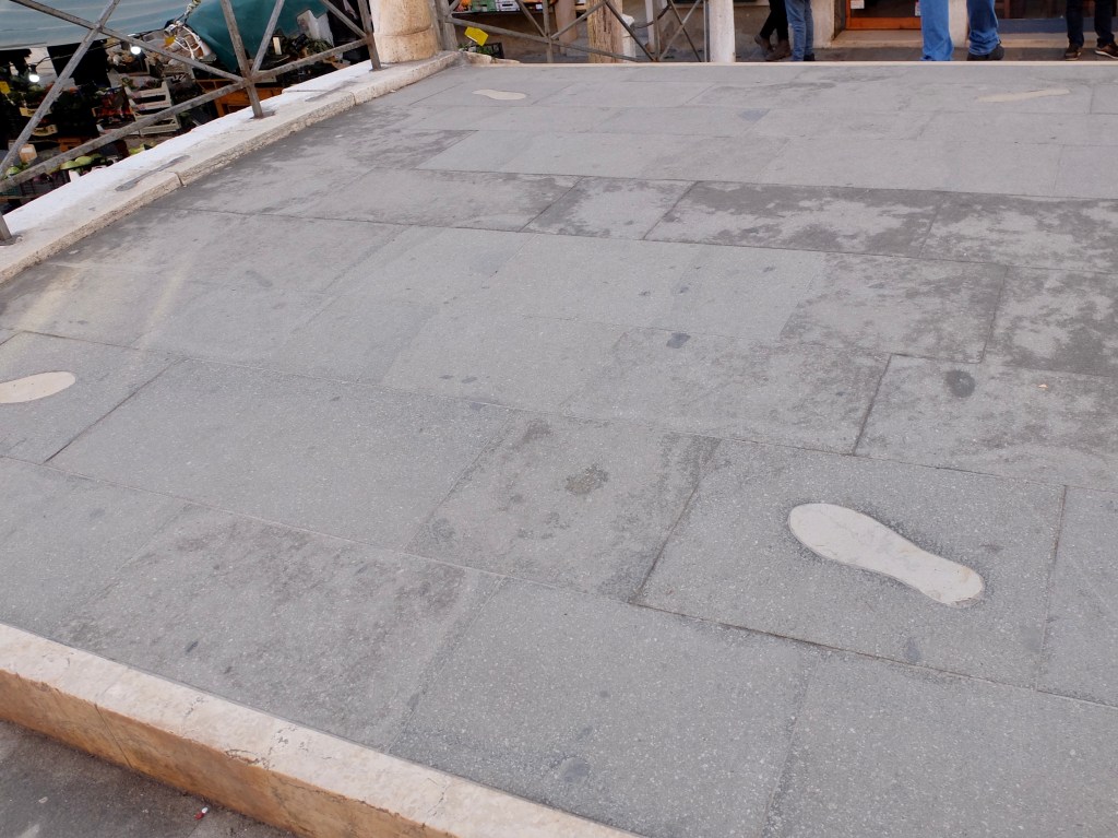 Estas huellas, marcan el lugar en el que se situaban los luchadores de dos familias venecianas muy poderosas: los Nicolotti y los Castellani, que se citaban aquí para pelearse a puñetazos (pugni). Dado que por entonces los puentes no tenían barandilla, el perdedor caía al agua, así que ganaba la banda que más contendientes conseguía mantener sobre el puente.