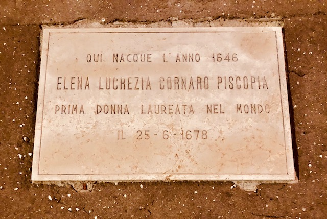 En este último viaje a Venecia, fui tras los pasos de Elena Lucrezia en busca de la placa, había leído sobre ella y quería localizar el lugar donde la primera mujer Doctorada tenía su homenaje en la ciudad. Me costó localizarla más de lo que habría querido y creo que se merece algo más que una losa por encima de las cabezas en un lateral del Palacio. Pero era mujer. Y me gustaría pensar que tras su reconocimiento por sus contemporáneos hay más que curiosidad por la existencia de un talento femenino. No en vano, su padre, que tanto le alentó en sus estudios, utilizó su poder y su influencia para impedir que otras mujeres después de Elena siguieran sus pasos, para evitar que eclipsaran a su hija.