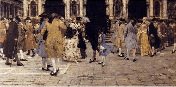 Pero sin duda el más famoso fue, y sigue siendo, el de la Plaza de San Marcos. Las damas venecianas consideraban de gran importancia pasear por el Listòn de la Plaza de San Marcos (llamado Lista di Piazza), porque era el modo de exhibirse y de ponerse al día de los acontecimientos y cotilleos de la ciudad. Y, aunque cualquier persona podía pasear por el listòn, lo cierto es que un espacio que se reservaba a los nobles que, como imaginaréis, aprovechaban la ocasión para pavonearse, flirtear y dejarse ver.