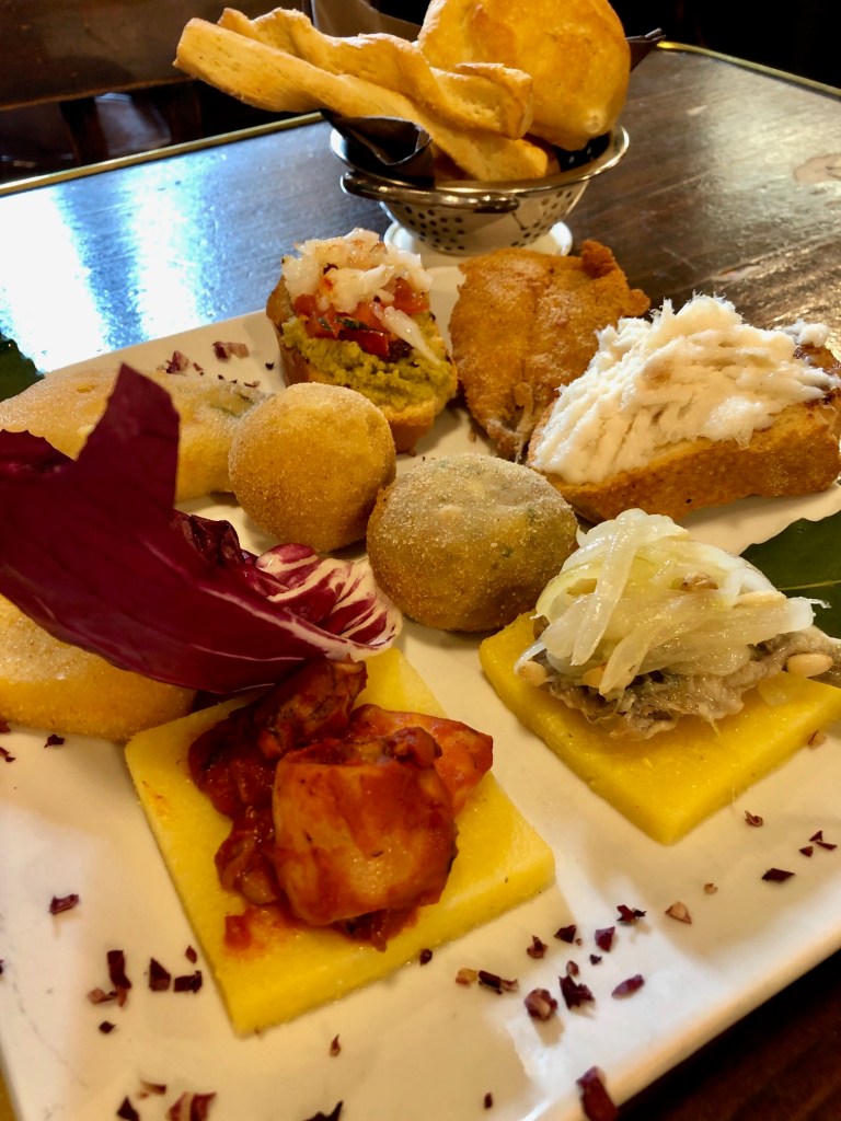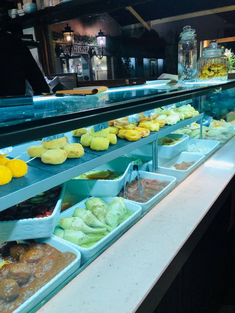 Algunos bacari tienen cocina y ofrecen menú del día, pero los más clásicos suelen tener tan solamente las tapas que os comento, los cichetti. Suelen ser pequeños fritos o montados de pan con todo tipo de embutidos, quesos, cremas variadas, encurtidos o cualquier otro ingrediente. Rienda suelta a la imaginación. Pero fundamental… los cichetti no se comparten!. Si no queréis que os miren mal, no pidáis que os los corten por la mitad ni un cuchillo para ello. Dicen que cada vez que alguien pide compartir un cichetti, un veneciano muere de pena en algún lugar…