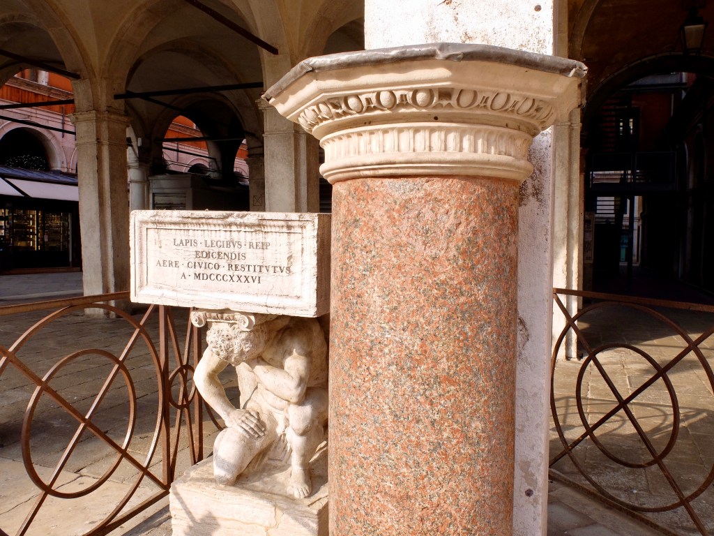 Junto a una columna de granito rosa, esculpida en piedra, representa a un hombre arrodillado que sostiene, sobre su cabeza, la escalera de mármol blanco sobre la que se encaramaban los comandadori, los heraldos de la Serenissima.