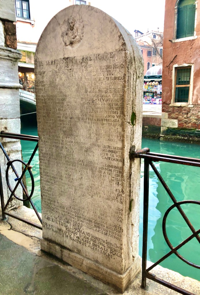 La colocación de la estela del pan en esta calle no es casual, ya que la panadería, en tiempos de la Serenísima, estaba encomendada a los forni, lugares donde se horneaba el pan; y a los pistori, que se encargaban de todo lo demás: molido, amasado, y modelado del pan. Como ya os he contado en otras ocasiones, la toponimia veneciana está estrechamente ligada a los oficios que se desarrollaban en las calles o sus cercanías.