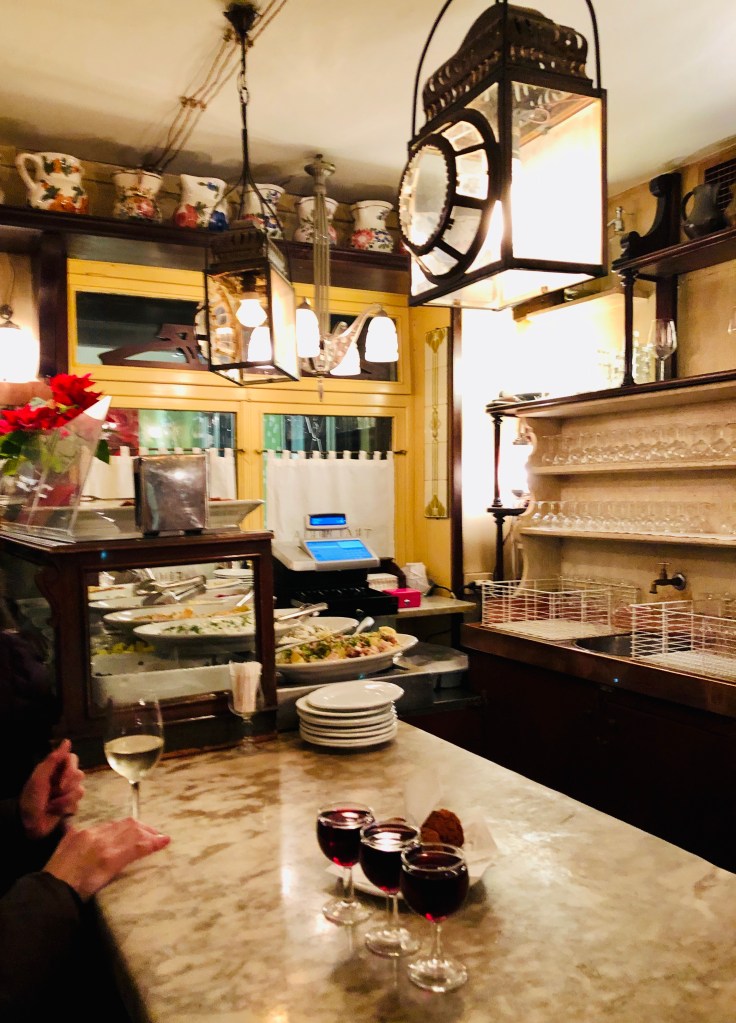 La barra es pequeña, para apenas 4 o 5 personas, pero tiene una amplia zona de comedor en la que degustar los platos típicos venecianos que suele estar llena incluso en invierno. No he comido allí, tan solo nos detenemos en la barra para, acodados con el resto de clientes, comprobar cómo salen bandejas repletas de polpette y cómo se rellenan continuamente la jarras de porcelana pintada de vino blanco o tinto. En esa barra, se amontonan bandejas con distintos cichetti de especialidades venecianas donde la elección se convierte en una aventura pero también en una apuesta segura.