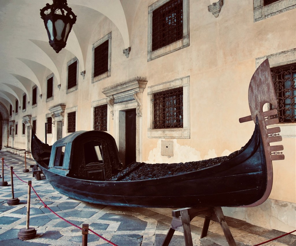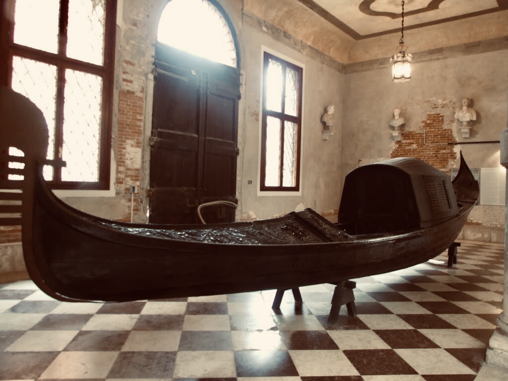 También en Ca´Rezzonico. En el vestíbulo de este Palazzo, hoy sede del museo del settecento veneciano, nos recibe un ejemplar bellísimo de góndola con felze. Ha sido restaurada hace poco porque estaba en un estado deplorable, muy dañada por la carcoma y la humedad. De hecho, durante mucho tiempo era visible desde el Gran Canal porque se exhibía en el pórtico de entrada al edificio, a la intemperie y a merced de la humedad, el salitre y la lluvia. Afortunadamente se ha podido rescatar para deleite de todos. Y además, esta preciosidad tiene nombre propio! Se le llama comúnmente Laura porque lleva una placa con una inscripción en la que aparece ese nombre junto.