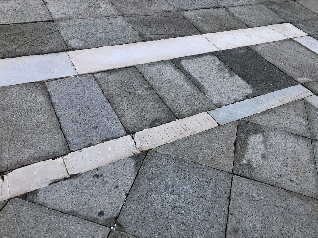 Sí que hay rastro, sin embargo, de otro pozo que debía ser de grandes dimensiones y en este último viaje, he podido localizarlo. Se construyó frente a la entonces existente iglesia de San Geminiano, dando la espalda a la Basílica, casi al final de la plaza del lado izquierdo. Esta iglesia fue derribada en 1807 para ampliar la Plaza de San Marcos con la construcción del Ala Napoleónica, pero podéis haceros una idea de cómo era con la obra de Canaletto, Piazza San Marco verso la Chiesa di San Geminiano (no se encuentra en Venecia, sino que pertenece a la Royal Collection de la familia Real Británica).