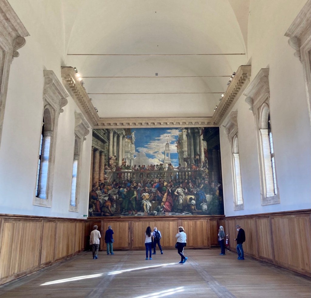 La primera es una visita al conjunto monumental de la Fundación Giorgio Cini e incluye el claustro de Palladio, el claustro de Buora, el refectorio palladiano con una copia (ahora os amplío) de las Bodas de Caná de Paolo Veronese, la sala de fotos y la escalera de Longhena (también os amplío enseguida). Se añade la vista sobre el laberinto de Borges. Cuesta 14,00€ e incluye audioguía (también en español) y el acompañamiento durante toda la visita de una persona que se limita a indicarte las pistas que debes escuchar.