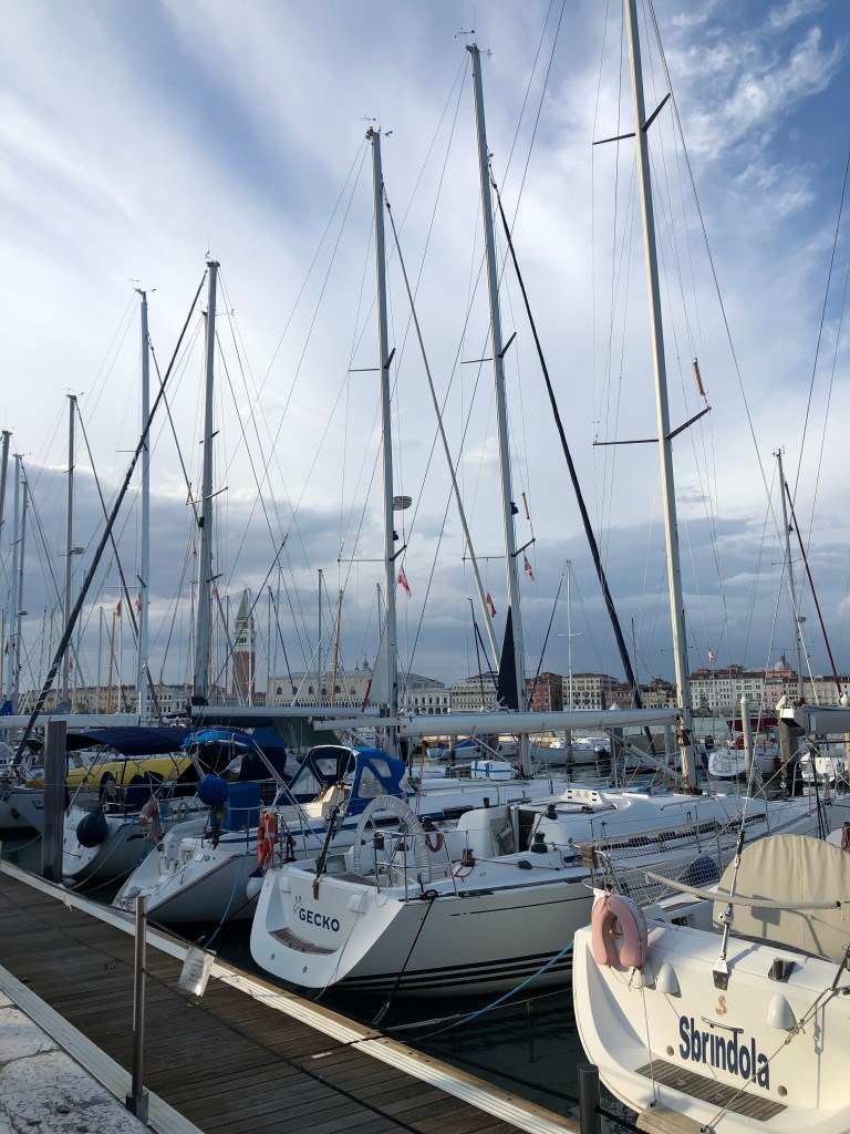 Finalmente, nuestra entrada incluía gratuitamente un aperitivo en el San Giorgio Café. Se ofertan dos opciones por el mismo precio, una con y otra sin aperitivo, no hay diferencia entre ambas salvo por la posibilidad de disfrutar del propio aperitivo así que, si al final os decidís a ir, elegidlo con él. Porque, aunque se nos comieron los mosquitos (es Venecia…), las vistas a Venecia desde la terraza de la cafetería son una delicia y, como el tiempo acompañaba, disfrutamos de un pequeño y merecido descanso tomando unos Spritz y unos Hugo.