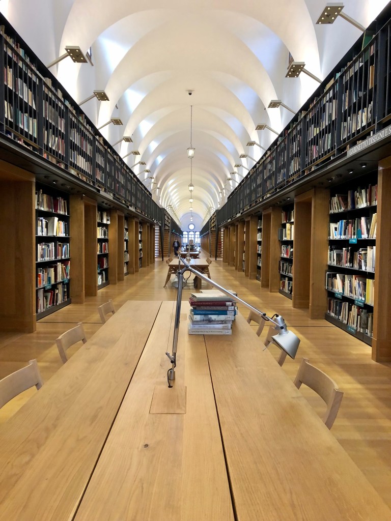 Terminada la visita a la Abazzia, nos hicieron salir del recinto y esperar durante casi media hora para volver a entrar a ver el laberinto. Más tiempo precioso perdido. Después, “visitamos” la biblioteca. Aquí reconozco que en la web sí se anuncia correctamente que la visita a la Nueva Manica Lunga, situada en el antiguo dormitorio benedictino transformado en centro bibliotecario, con más de 1400 metros lineales de estanterías, y especializada en historia del arte, está suspendida por motivos de seguridad debido a la Covid. Hasta aquí nada que objetar. Salvo porque mientras nos quedábamos en la entrada observando cariacontecidos y de lejos los estantes plagados de volúmenes dignos de inspeccionar, las personas del mismo grupo que había accedido a la escalera de Longhena, pasaron por delante de nosotros y sí accedieron al interior de la biblioteca. Otro despropósito absurdo e incompresible.