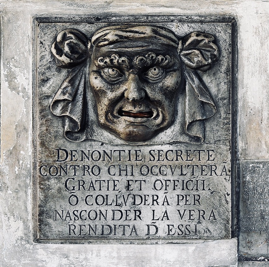 Estas cabezas, en el lugar de la boca, tenían un agujero en el que los venecianos podían depositar las denuncias de manera secreta, denuncias referidas a delitos que fueran de conocimiento del denunciante y que no quisiera ponerse en evidencia. Y digo secreta, sí, que no es lo mismo que anónima. Me explico…