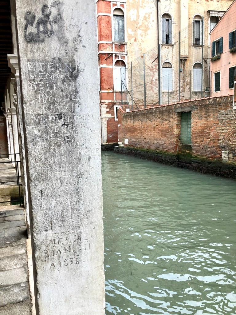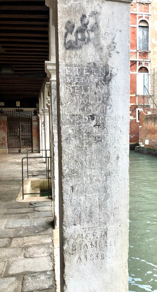 Bien, este grafiti del que os hablo hoy, se encuentra en el sestiere de Cannaregio, concretamente en el Sottoportego del Traghetto sobre el rio dei Santi Apostoli. En él se inmortaliza la helada de 1864 en la que se podía ir caminando desde las Fondamente Nuove hasta el cementerio de San Michele y se puede leer: “eterna memoria dell´anno 1864, del giaccio veduto in Venezia, che se sta sule Fondamenta Nove, a San Cristoforo andava la gente, en procision che formava un liston, Vincenzo Bianchi”; algo como “eterno recuerdo del año 1864, de la helada acaecida en Venecia, desde Fondamenta Nueva a San Cristoforo iba la gente en procesión formando un liston” Y firma Vincenzo Bianchi.