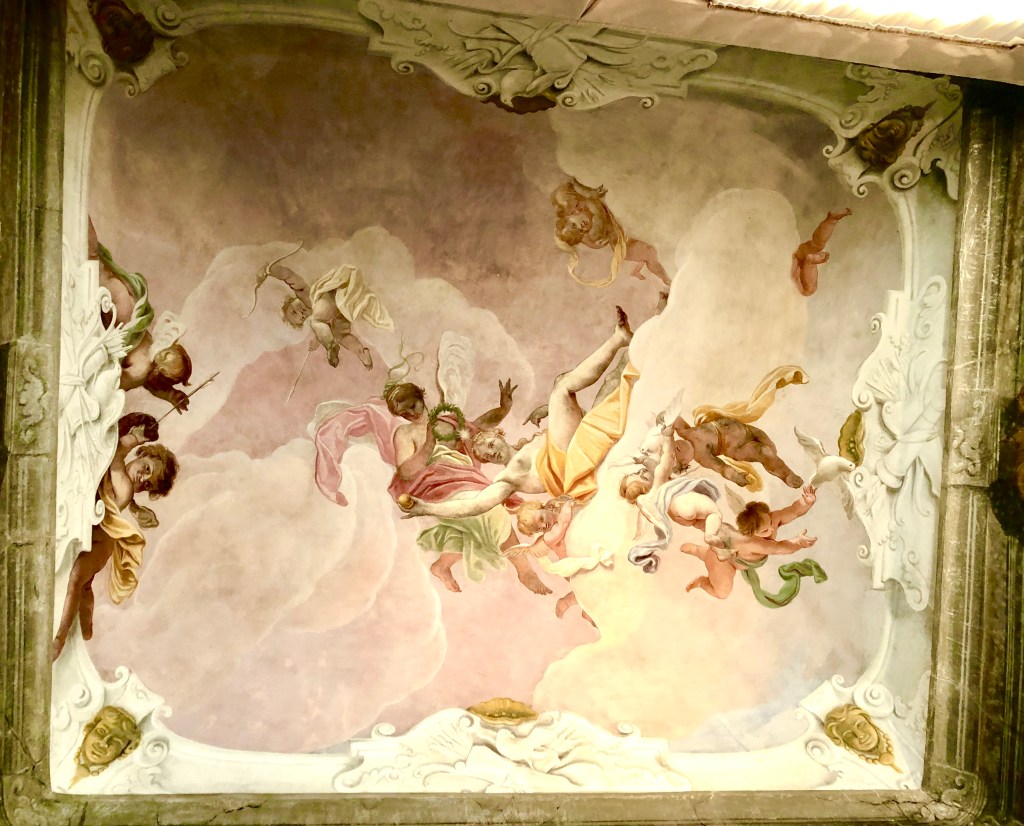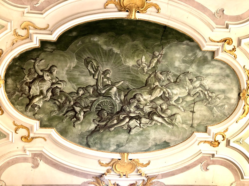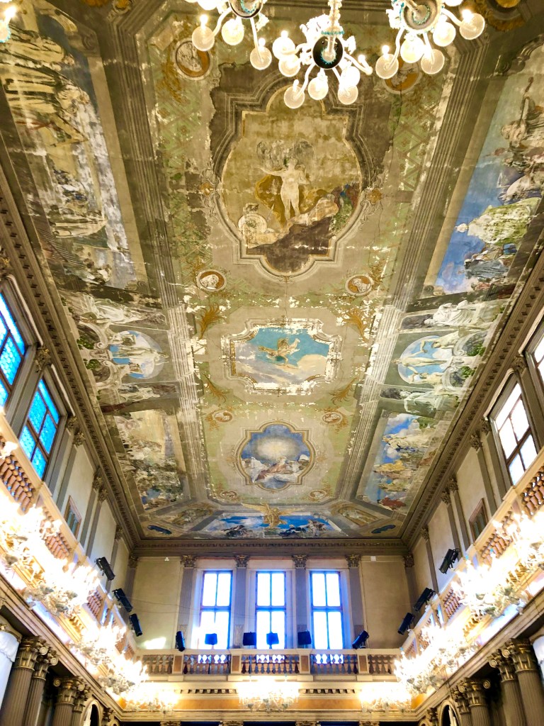 El salón de baile, se utiliza hoy en día para conciertos. Lo pudimos ver apenas porque había un grupo de alumnos ensayando pero, al estar tan altos, se apreciaba el asombroso techo, en el que se representa la glorificación de la música.