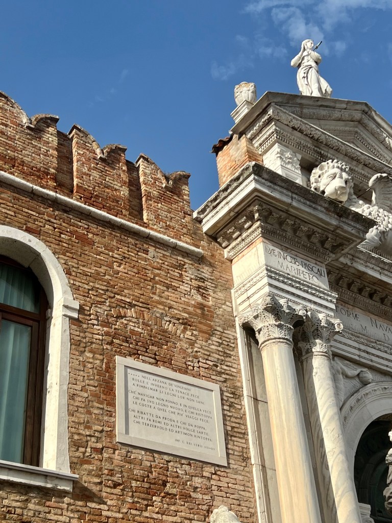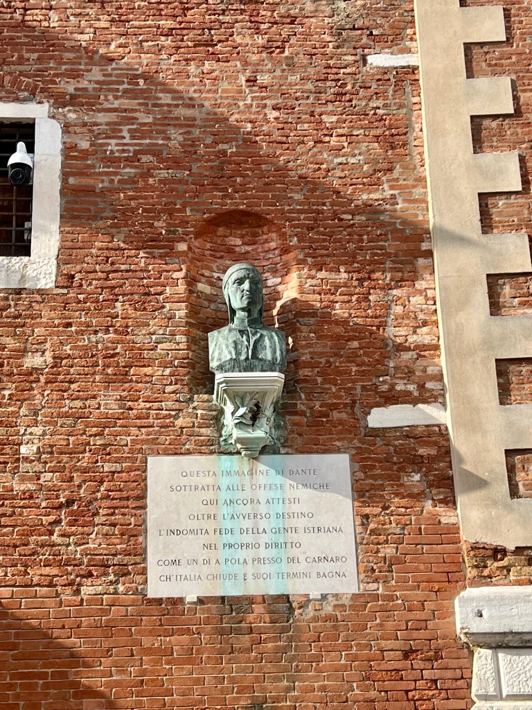 Y hay más: junto a la puerta, en una cornisa en la pared, hay un busto de bronce del propio Dante sobre una placa de mármol que recuerda el paso del poeta por Venecia. Y otra placa alude a los versos de la obra señalando: “en el Arsenal de los venecianos la brea tenaz hierve en invierno para reponer sus bosques insalubres”.