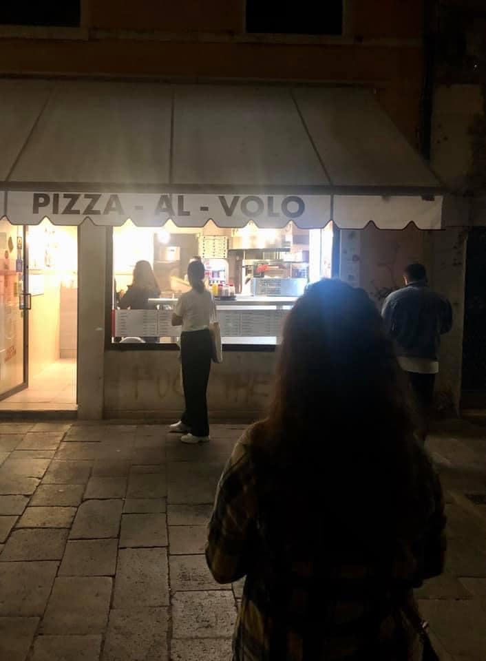 En Venecia veréis muchos lugares en los que comprar algo de comida para llevar. Sin duda mi lugar favorito de la ciudad es la Pizzeria Al Volo, en el animado Campo Santa Margherita. Aquí podéis adquirir una buena porción de pizza (o la pizza entera!) y salir a comerla al Campo o llevarla a vuestro alojamiento. La de noches que hemos hecho «botellón», Antonio y yo, en uno de esos bancos, con nuestra pizza y nuestra Moretti en la mano. Precio: 2,00€.